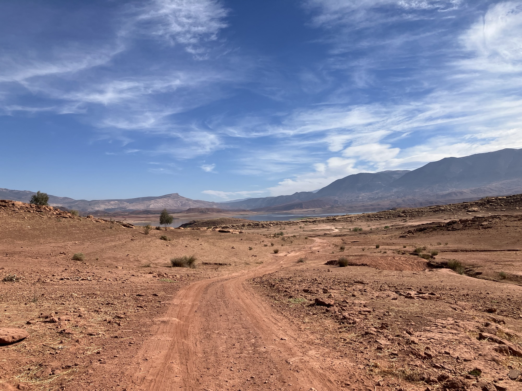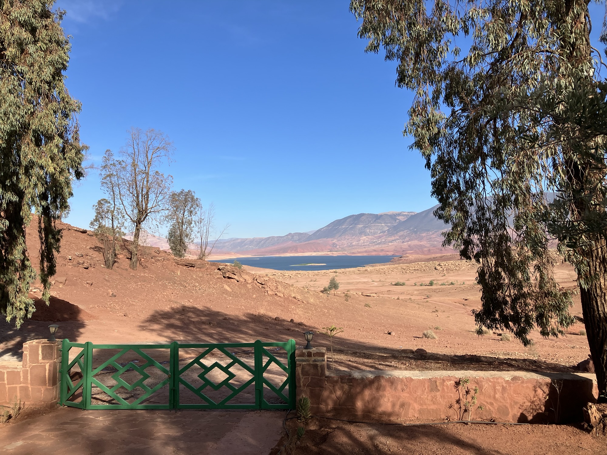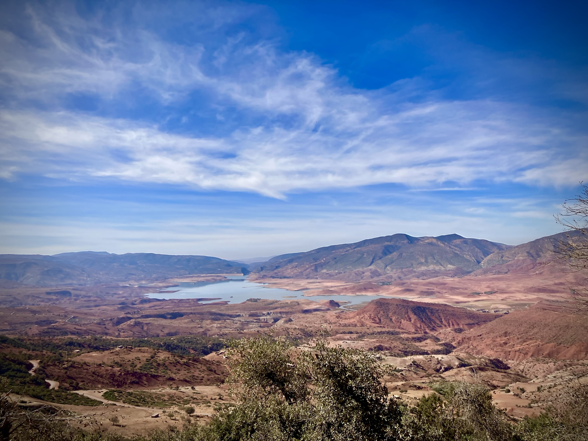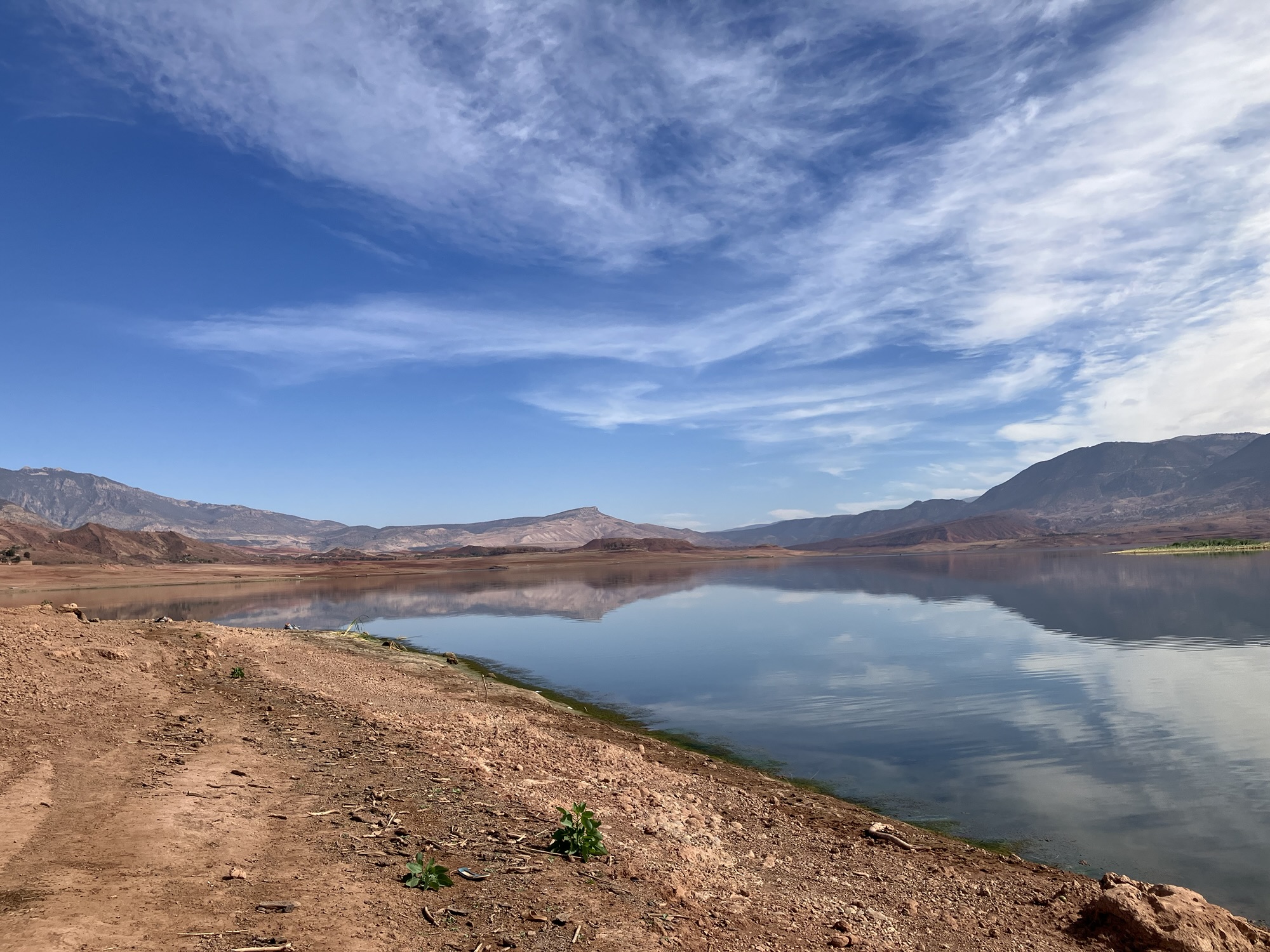 Ein Mal geht noch. Da wir am Vortag schon großteils die Schotterpiste nehmen mussten, wurde umgeplant. Diesmal nur Asphalt und nur ein kleines Stück Schotter. Mal sehen, was es wirklich wird am Weg zu La Cathedral, ein großer Felsen, der wie eine Kathedrale aussehen soll. Diesmal umrundeten wir den Bin El Ouidane Stausee, oder besser das Terrain, dass er bei viel Wasser bedeckt, eine riesige Fläche in schönster Landschaft eingebettet. Die Straße war in der Tat asphaltiert, nur die letzten Kilometer führten über eine Ausbaustrecke – die Bagger waren schon da – bis zum Fuße des Felsen La Cathedral. Wir hielten für unser Picknick am plätschernden Fluss. Abgesehen von dem von Besuchern zurückgelassenen Müll und den zerbrochenen Glasflaschen, war es eine willkommene Pause in der Natur.