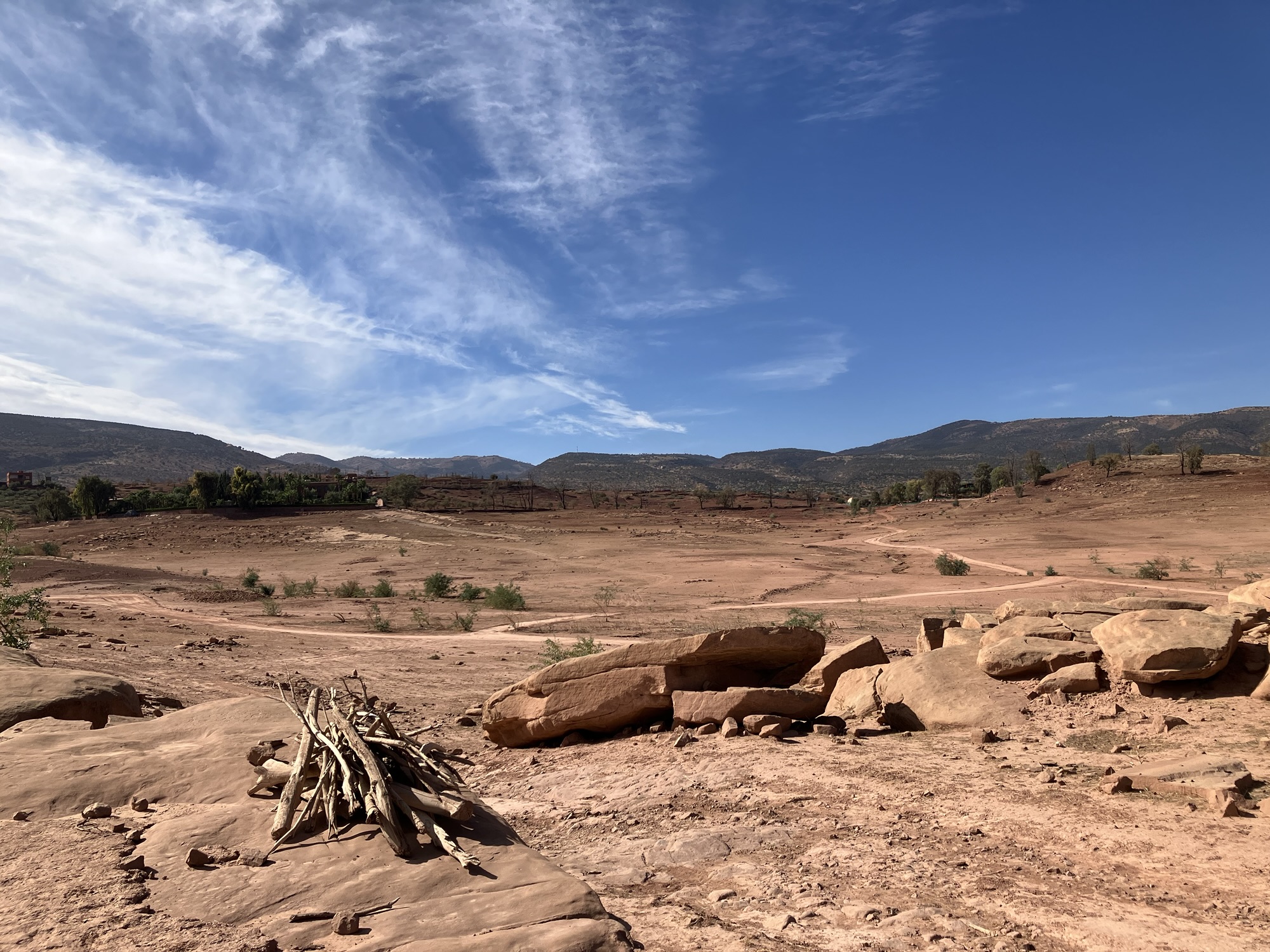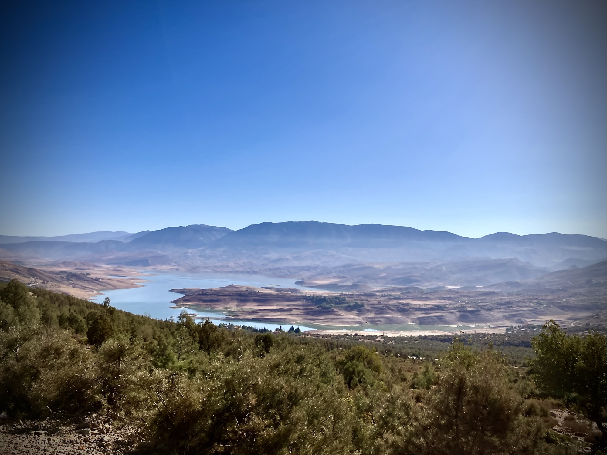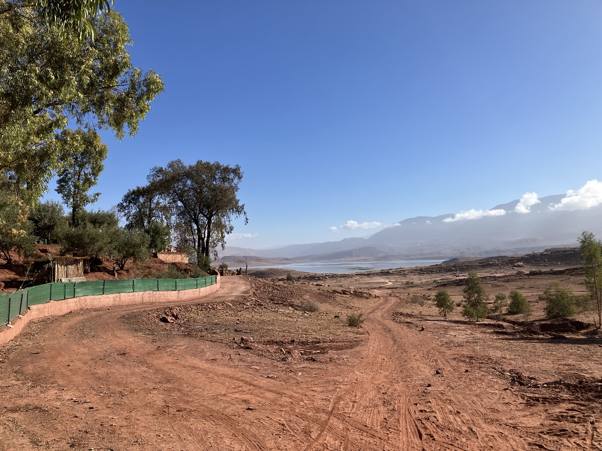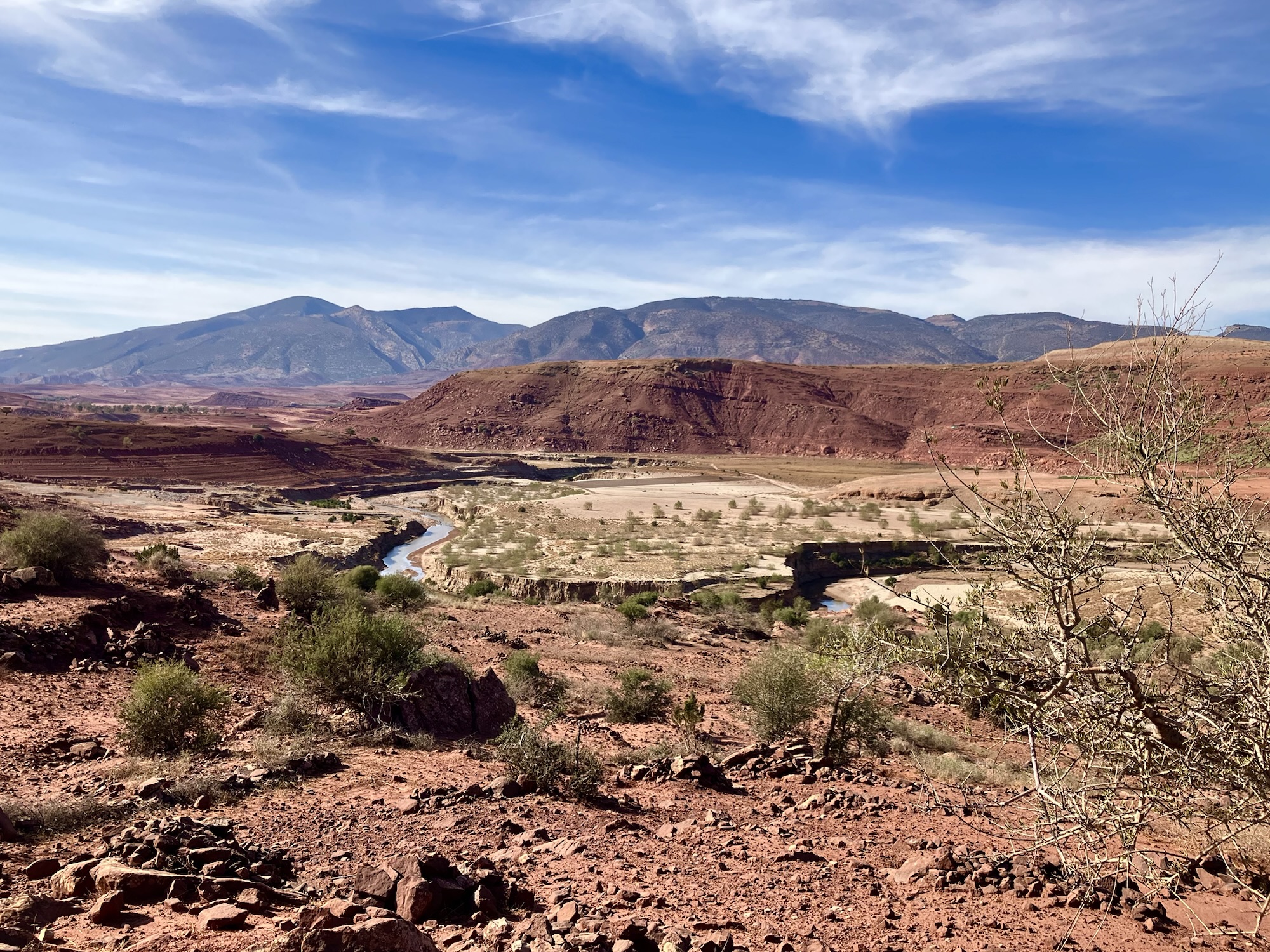 Ein Mal geht noch. Da wir am Vortag schon großteils die Schotterpiste nehmen mussten, wurde umgeplant. Diesmal nur Asphalt und nur ein kleines Stück Schotter. Mal sehen, was es wirklich wird am Weg zu La Cathedral, ein großer Felsen, der wie eine Kathedrale aussehen soll. Diesmal umrundeten wir den Bin El Ouidane Stausee, oder besser das Terrain, dass er bei viel Wasser bedeckt, eine riesige Fläche in schönster Landschaft eingebettet. Die Straße war in der Tat asphaltiert, nur die letzten Kilometer führten über eine Ausbaustrecke – die Bagger waren schon da – bis zum Fuße des Felsen La Cathedral. Wir hielten für unser Picknick am plätschernden Fluss. Abgesehen von dem von Besuchern zurückgelassenen Müll und den zerbrochenen Glasflaschen, war es eine willkommene Pause in der Natur.