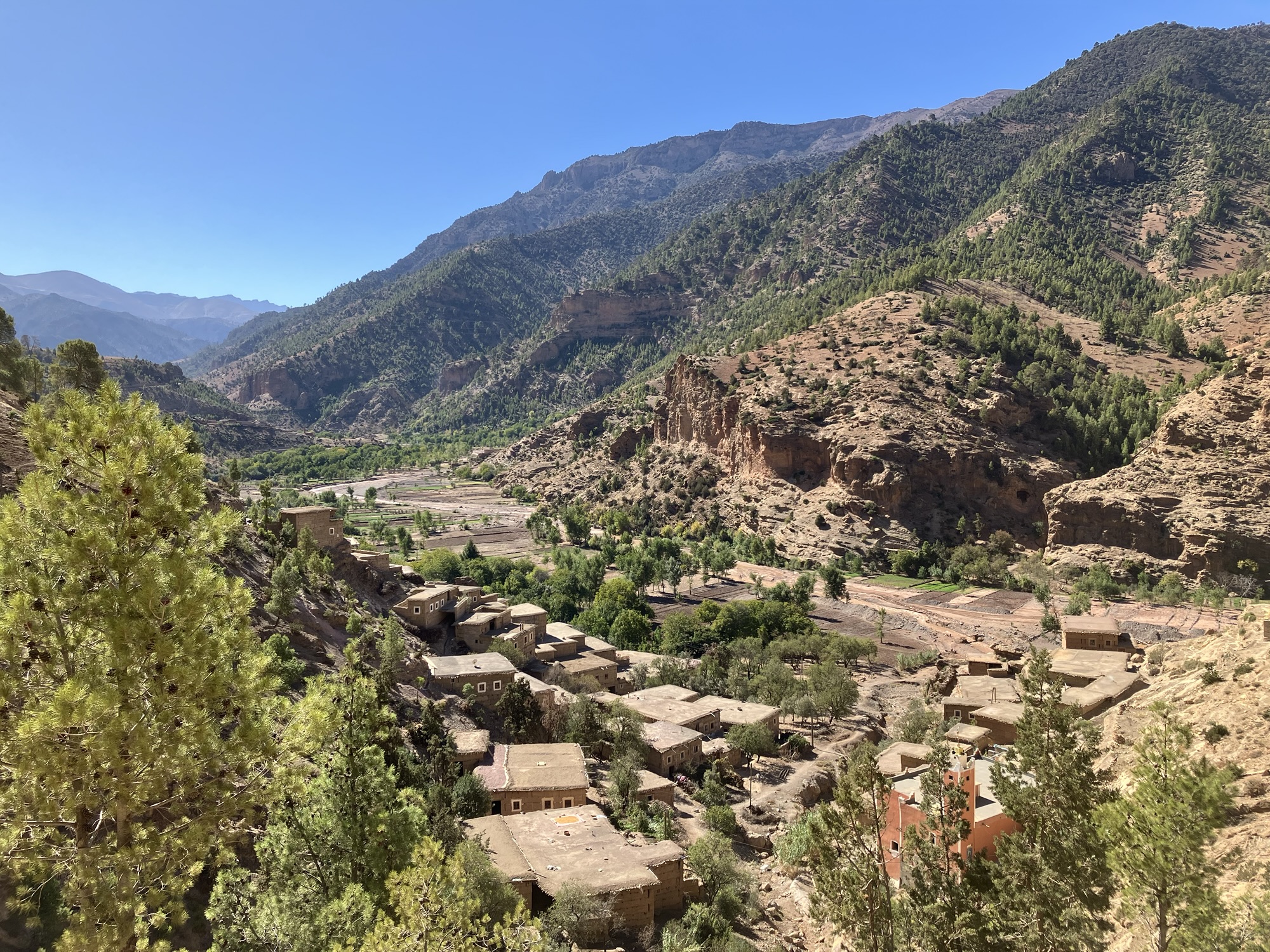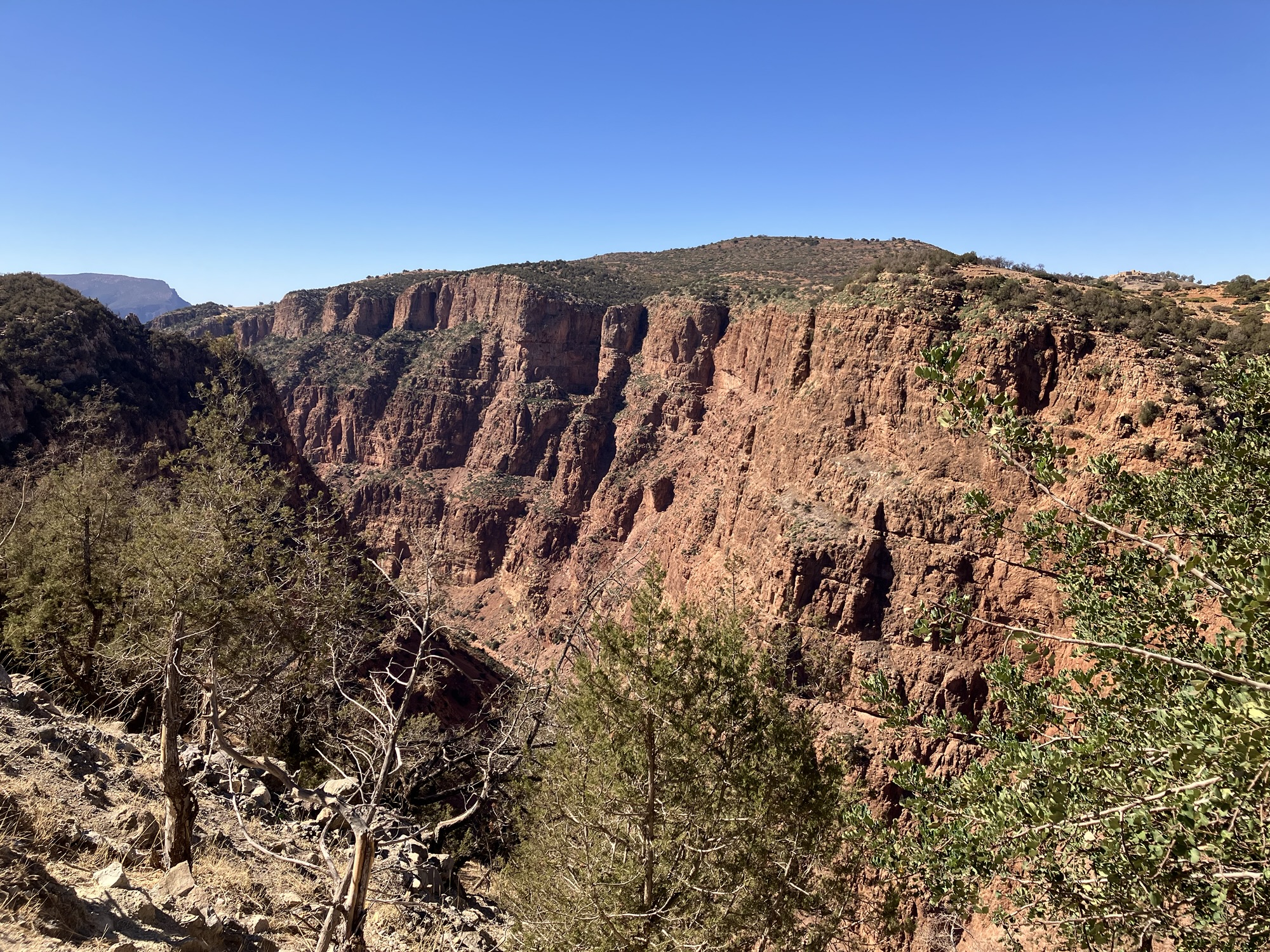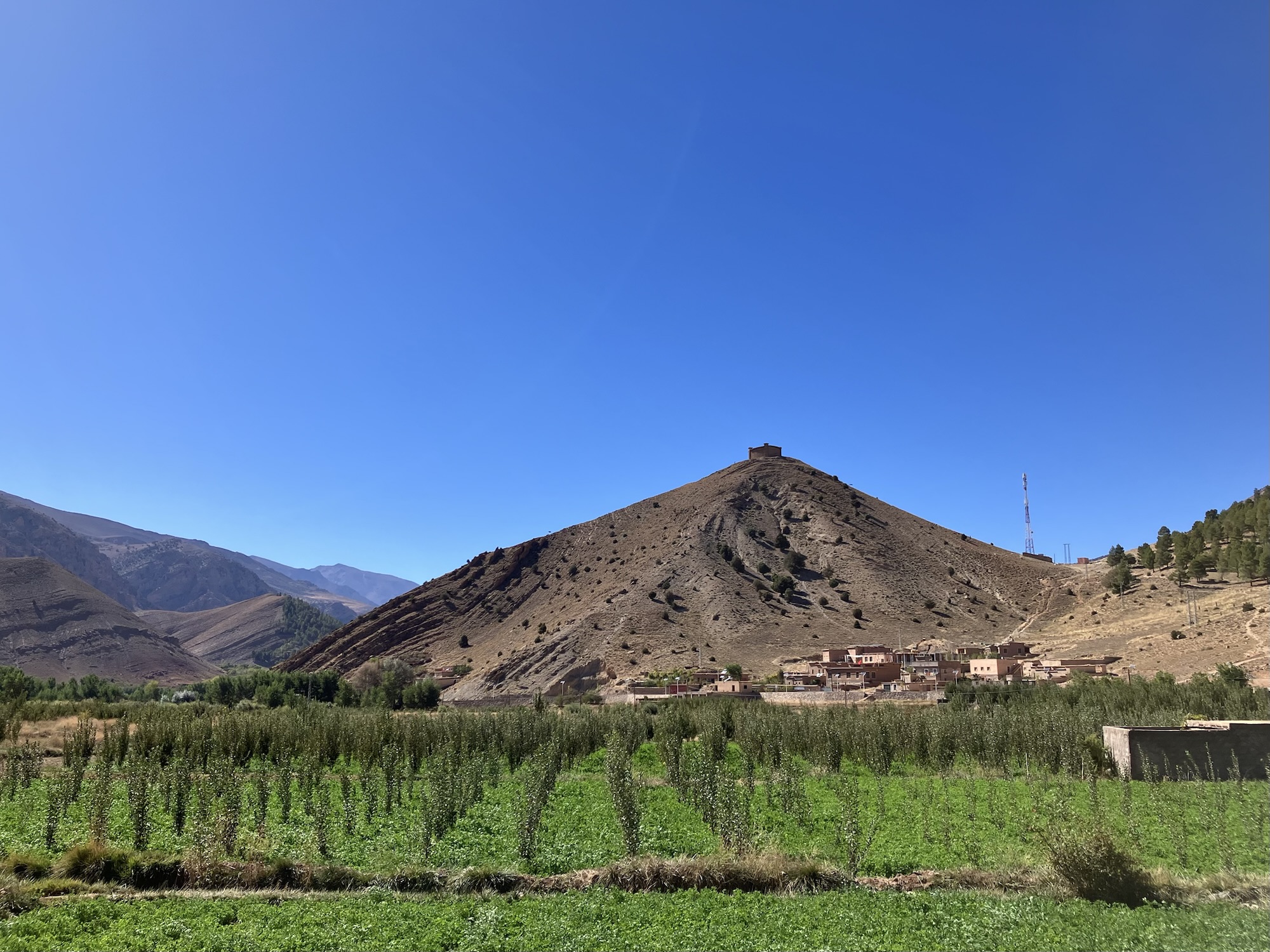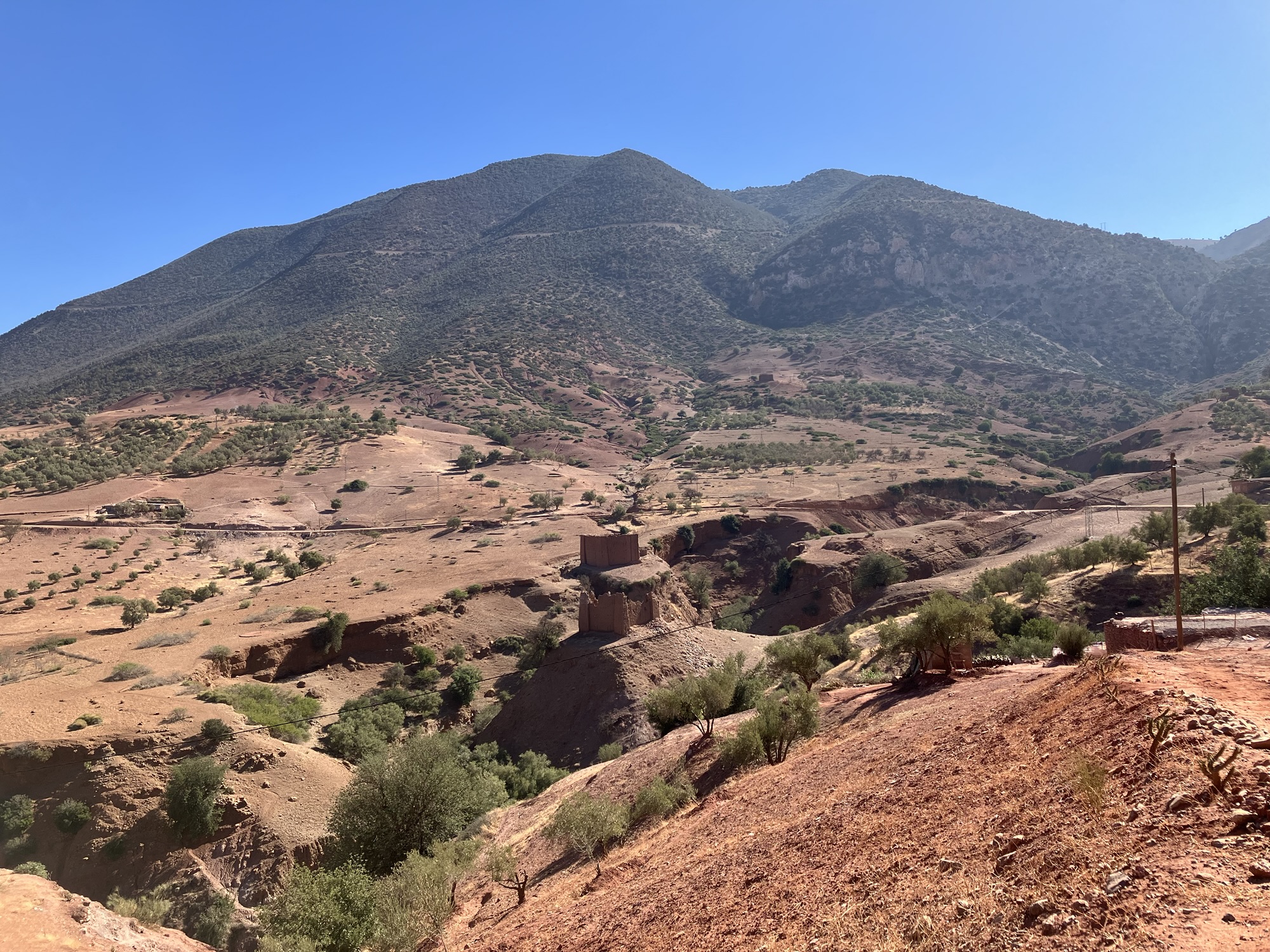 Ein Mal geht noch. Da wir am Vortag schon großteils die Schotterpiste nehmen mussten, wurde umgeplant. Diesmal nur Asphalt und nur ein kleines Stück Schotter. Mal sehen, was es wirklich wird am Weg zu La Cathedral, ein großer Felsen, der wie eine Kathedrale aussehen soll. Diesmal umrundeten wir den Bin El Ouidane Stausee, oder besser das Terrain, dass er bei viel Wasser bedeckt, eine riesige Fläche in schönster Landschaft eingebettet. Die Straße war in der Tat asphaltiert, nur die letzten Kilometer führten über eine Ausbaustrecke – die Bagger waren schon da – bis zum Fuße des Felsen La Cathedral. Wir hielten für unser Picknick am plätschernden Fluss. Abgesehen von dem von Besuchern zurückgelassenen Müll und den zerbrochenen Glasflaschen, war es eine willkommene Pause in der Natur.