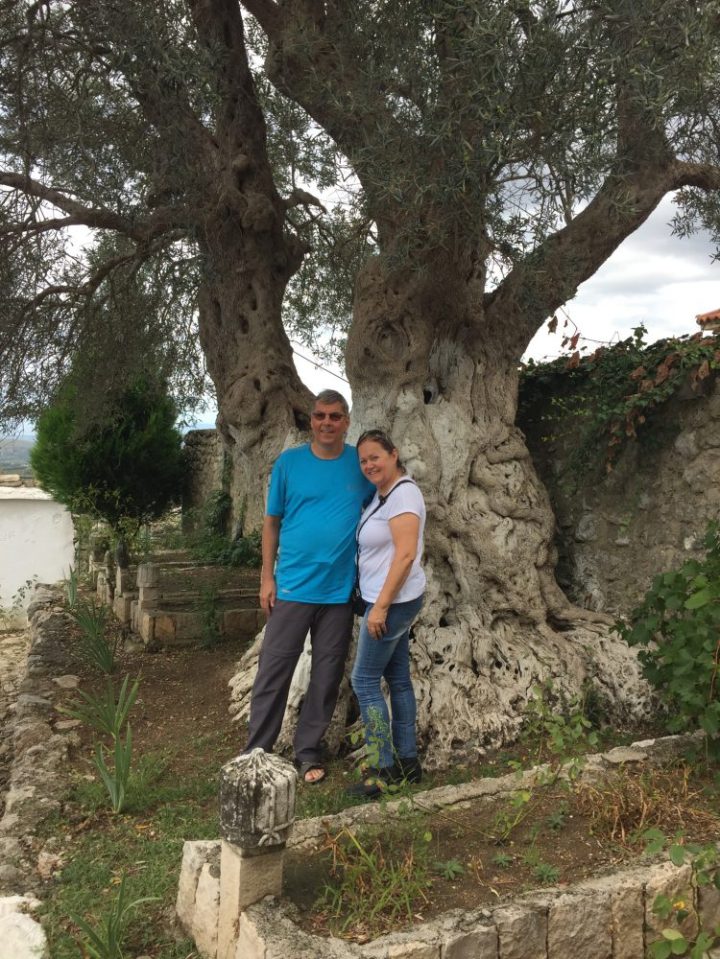 Ami & Pi vor dem 300 Jahre alten Olivenbaum in Kruja
