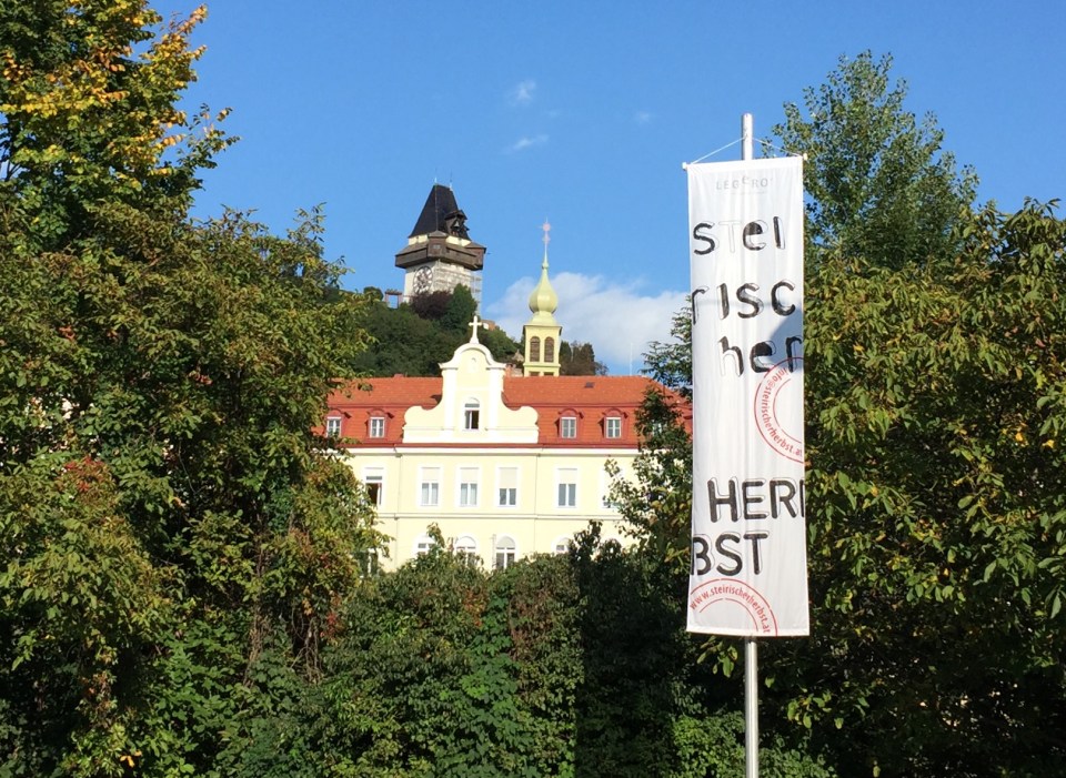 Uhrturm in Graz und Flagge vom Steierischen Herbst