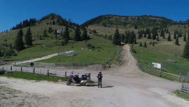 So bogen wir ab zum Lacu Vidra, wieder eine super Strecke, die Wolken lichteten sich. In der Kurve am Ende des Sees lockte ein gatschiges Staßerl. Planänderung – Off road und mit viel Endurofeeling ging´s nach Voineasa. Abenteuerlich höppelten wir anfänglich noch über aufgebrochenes Kopfsteinpflaster, dann durch mit Wasser gefüllte Schlaglöcher und matschige Wegpassagen. Ziemlich dreckig kamen wir nach der Rundfahrt wieder zur Kurve am Ende des Sees zurück. Der Bauer freute sich, weil wir jetzt Käse für unsere Jause kauften.
