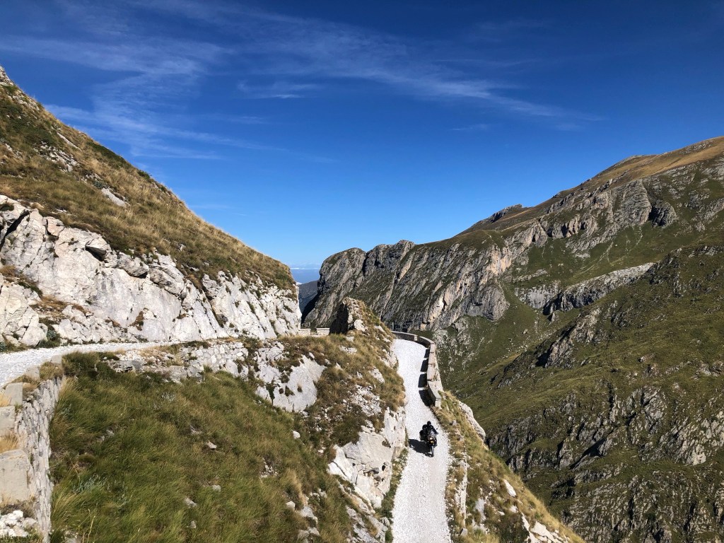 Bis zuletzt wurde der Fahrtag ausgekostet. Der S. Christina Pass – unser 70. Zielpunkt vom Pässemarathon – und noch ein paar weitere Schmankerl lagen auf der Strecke nach Feldkirch, von wo aus wir mit dem Motorrad-Reisezug wieder gegen Osten zogen. Aber vorher mussten wir von Italien durch die Schweiz, um nach Vorarlberg zu kommen. Von Schilpario aus überquerten wir auf der einspurigen Passstrasse den Passo del Vivione, der die lombardischen Seitentäler Valle Paisco/Provinz Bergamo und das Valle di Scalve/Provinz Brescia verbindet. Dies Strecke ist landschaftlich wunderschön. Mulmig würde einem in den engen Kehren bei massivem Gegenverkehr. Wir waren zeitig dran, daher waren noch nicht viele unterwegs. Nur ein paar Motorradfahrer begegneten uns. Auf der Passhöhe kurz vor 10:00 Uhr sah das dann schon anders aus. Ich war verwundert, dass da schon Bier von ein paar italienischen Bikern getrunken wurde. Gut, dass diese Partie nicht in unsere Richtung unterwegs war. Es war super, dass wir es diesmal geschafft hatten, den Passo del Vivione mit seinen 1828 m zu befahren. Anläufe gab es schon mehrere, jedoch immer passte was nicht.